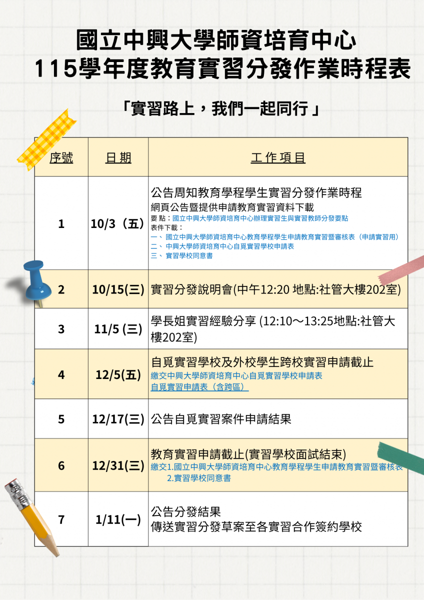 1 | 10/9(三) | 公告周知教育學程學生實習分發作業時程 網頁公告暨提供申請教育實習資料下載 要 點:國立中興大學師資培育中心辦理實習生與實習教師分發要點表件下載: