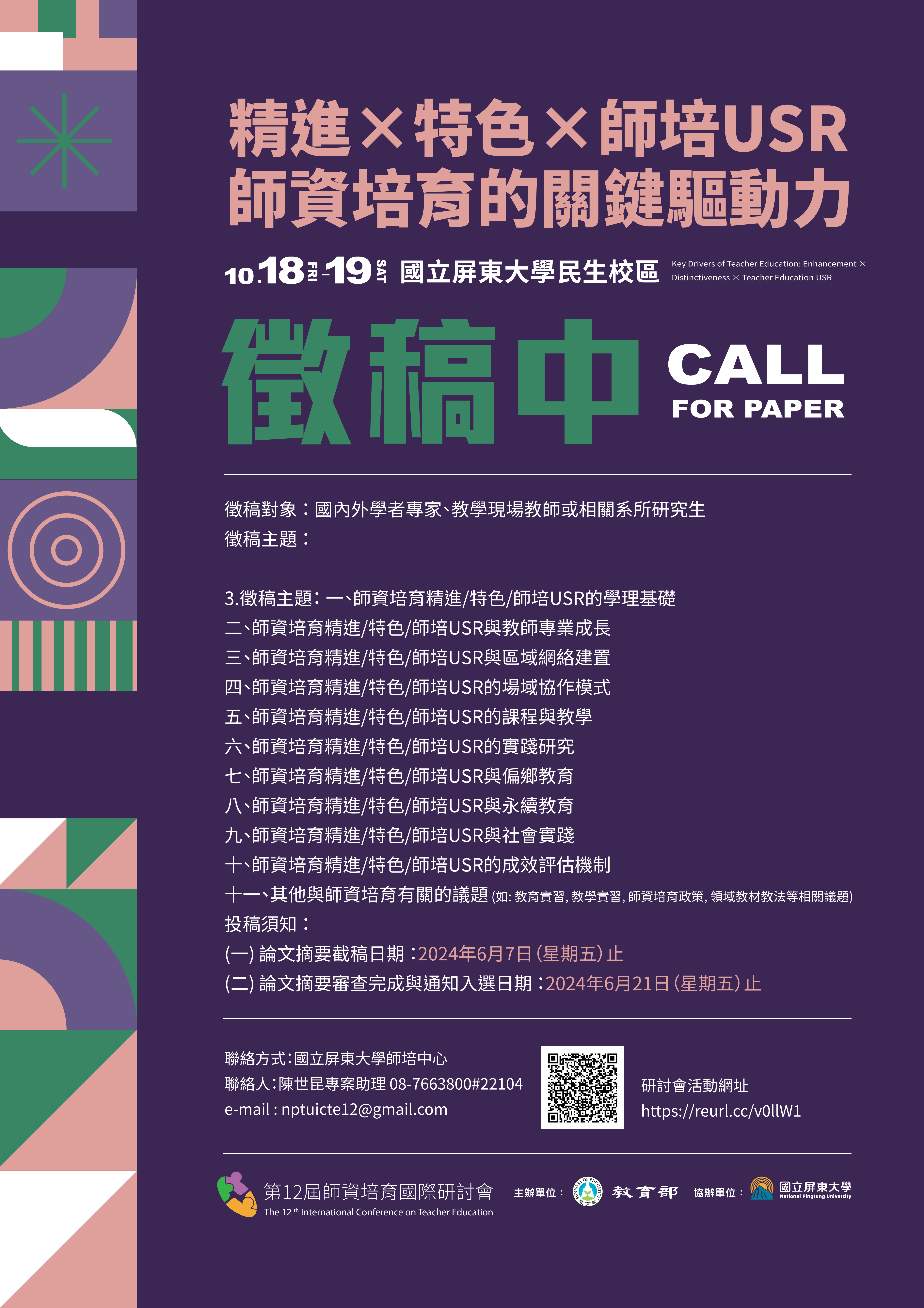 國立屏東大學於113年10月18日(星期五)至1 9日(星期六)假國立屏東大學民生校區五育樓(屏東市民生路4- 18號)辦理「113年第十二屆師資培育國際學術研討會」,歡迎踴躍報名參加。