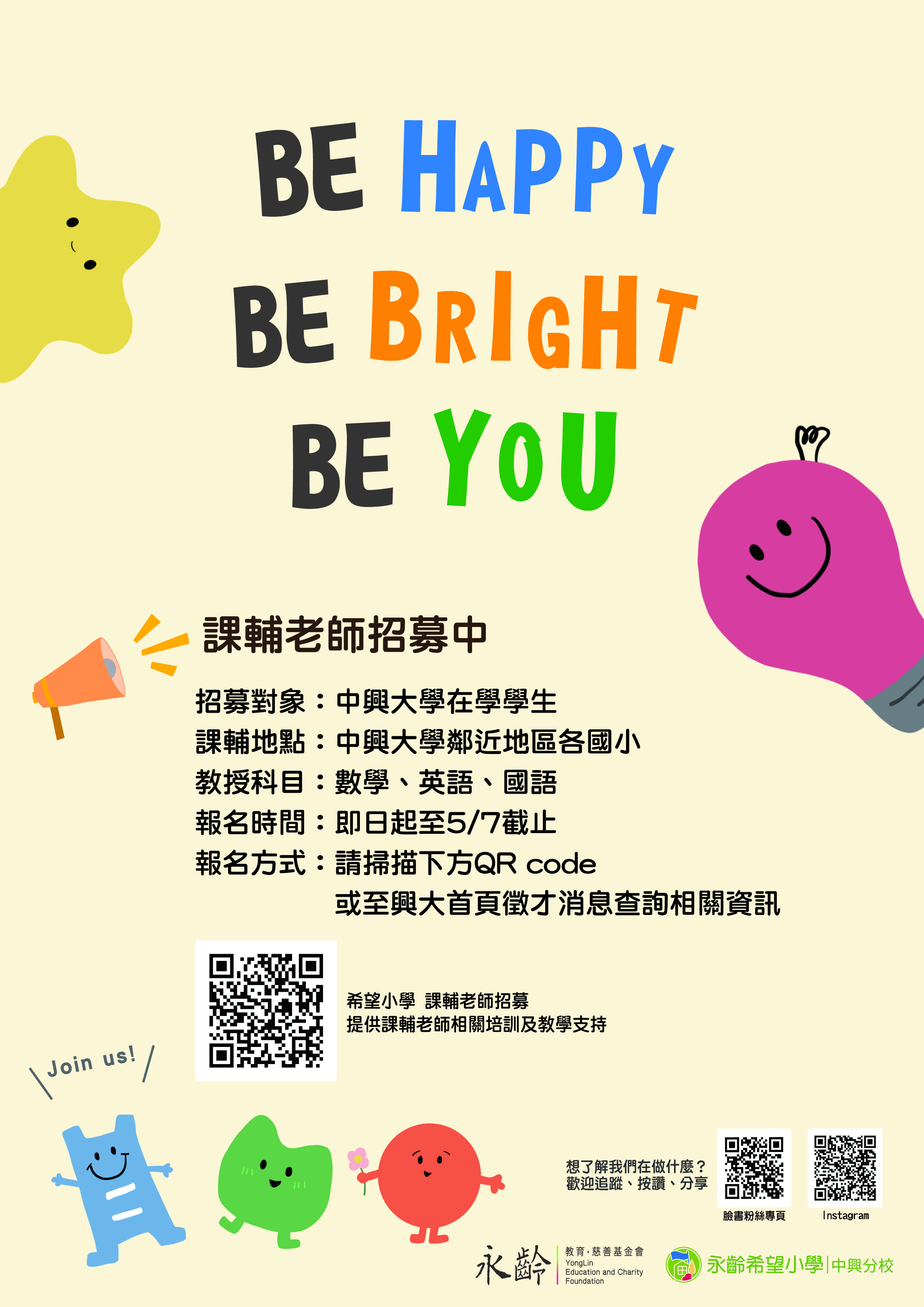 永齡希望小學在中興大學成立已邁入第13年。 13年來已有數百位中興大學學生與我們一起投入愛的行動, 服務逾千名家庭弱勢學童。