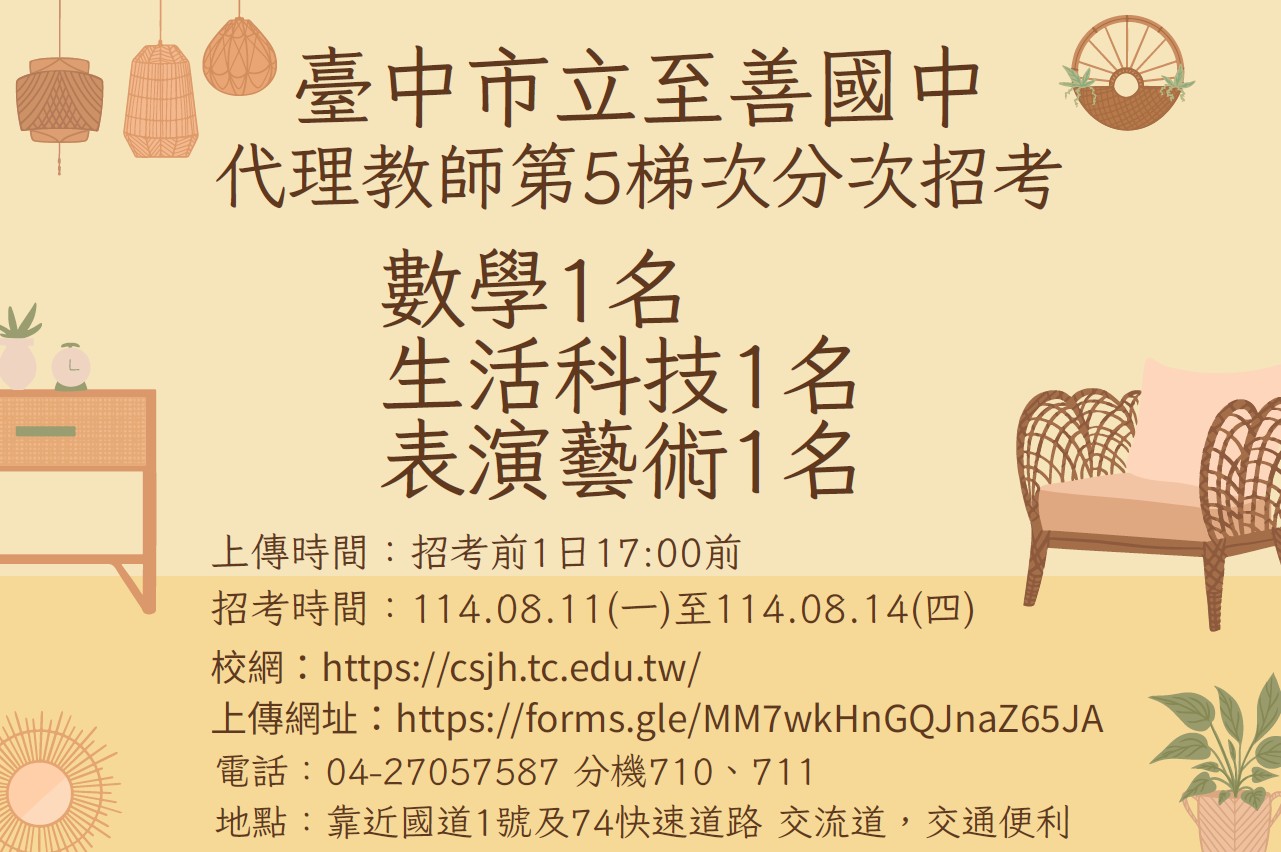 臺中市立至善國民中學114 學年度第1學期第5梯次代理教師甄選