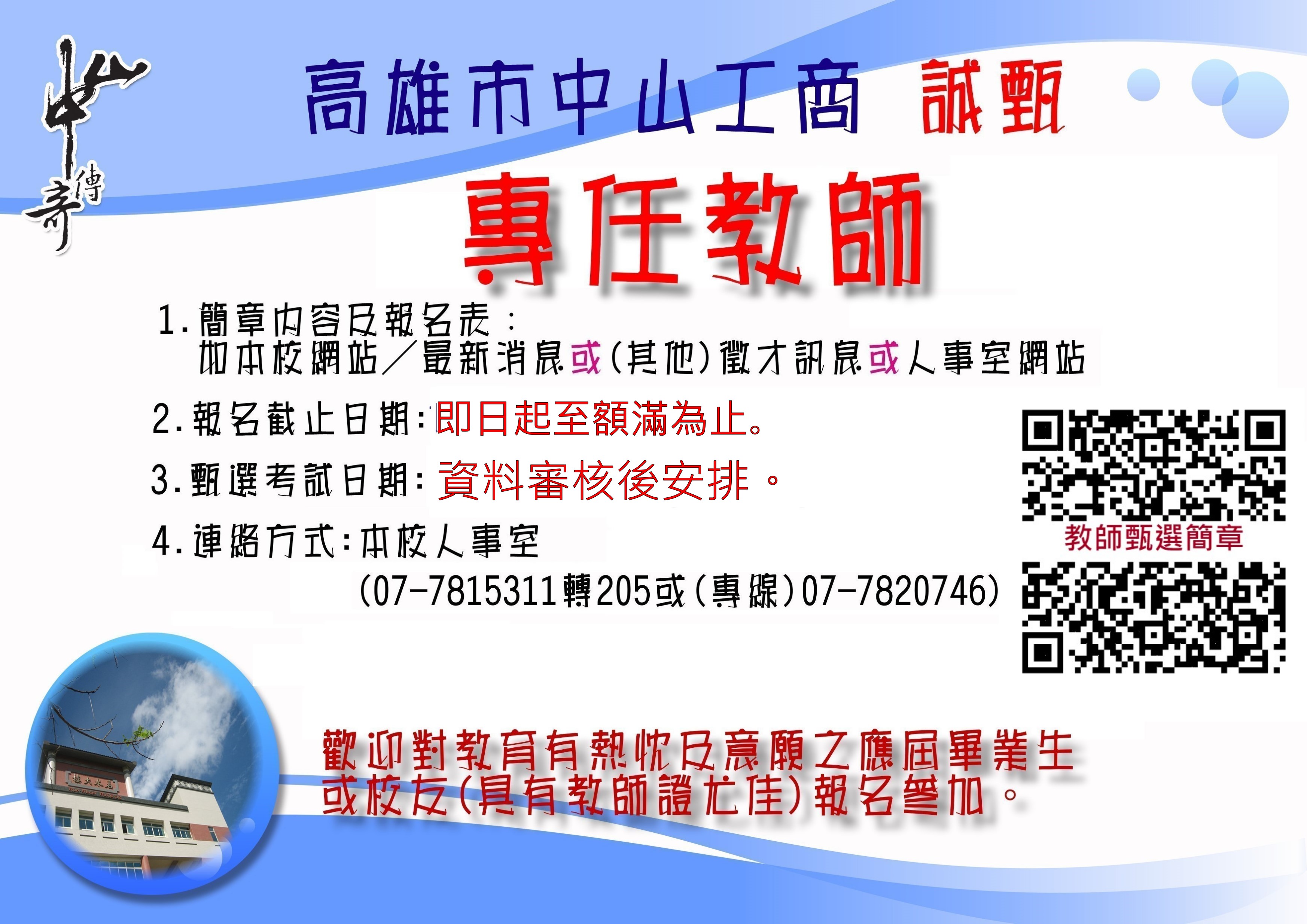 【轉發】高雄市中山工商113學年度教師甄選相關資訊
